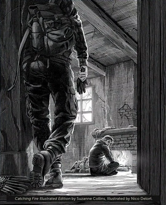 Katniss i Gale w domku nad jeziorem w ilustrowanej edycji W pierścieniu ognia.