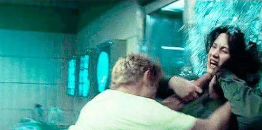 Razem z Peetą i Mags zagłębiają się w dżunglę, szukając słodkiej wody. Katniss zauważając lśniącą powłokę, uświadamia sobie, że to pole siłowe. Zanim zdąża powstrzymać Peetę, ten zostaje przez nie odepchnięty. Katniss zaczyna panikować, gdy dochodzi do wniosku, że ten nie oddycha: z początku myśli, że Finnick chce go skrzywdzić, ale w końcu rozumie, że on go reanimuje. Mimo sprzecznych uczuć, naprawdę martwi się o Peetę, bojąc się, że może umrzeć.